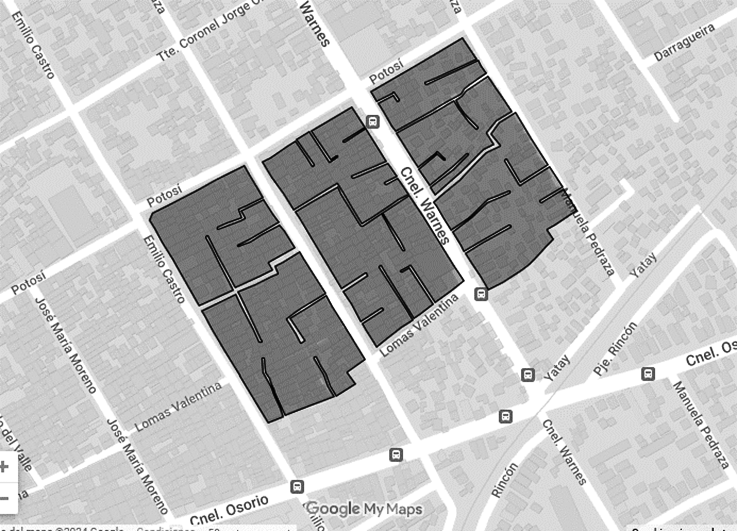 El relevamiento abarcó un sector del barrio, delimitado por las calles: Warnes, Potosí, Pedraza, Osorio y el límite del ferrocarril Belgrano (ramal Belgrano Sur). Son tres grandes macizos que juntos tienen la dimensión aproximada de nueve manzanas tradicionales o tres manzanas cada uno.