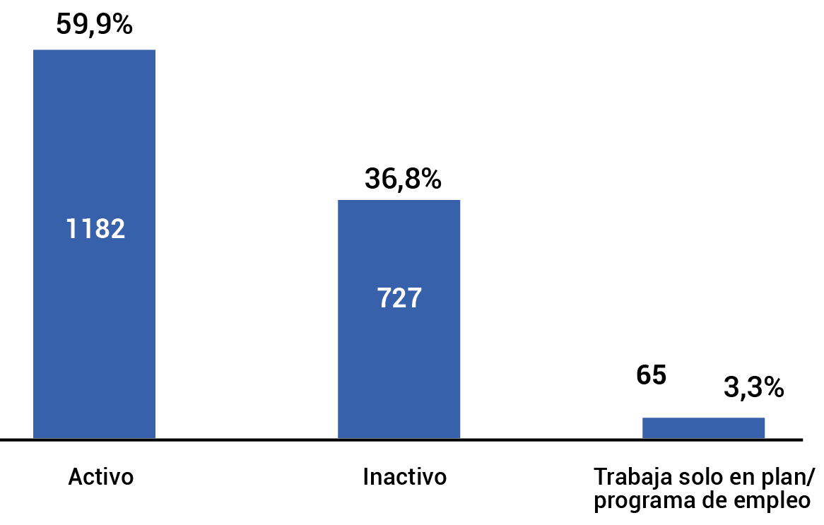 - Solo recibe plan de empleo: esta una tercera categoría que incluye a quienes declaran tener plan de empleo, pero no trabajo mercantil tradicional por el cual realizan alguna contraprestación. Quienes sí lo hacen quedan comprendidos en la categoría Activo.