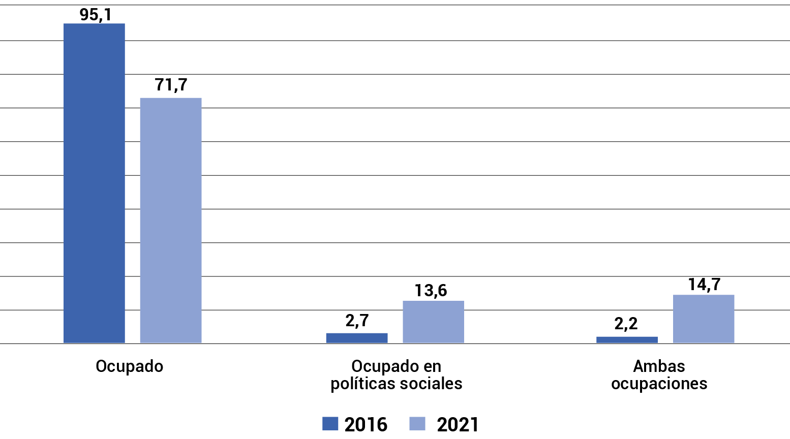 - Ambas ocupaciones: corresponde a los que responden que sí a las preguntas sobre si trabaja actualmente y sobre si recibe una política social de transferencias monetarias por la que deba hacer alguna contraprestación.7