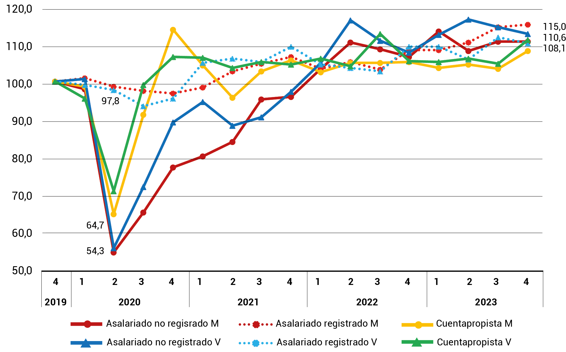 | Año | Tasa de actividad | Tasa de empleo | Tasa de desocupación | Tasa de informalidad | Ingresos laborales | Ingresos laborales (no registrados/as) |