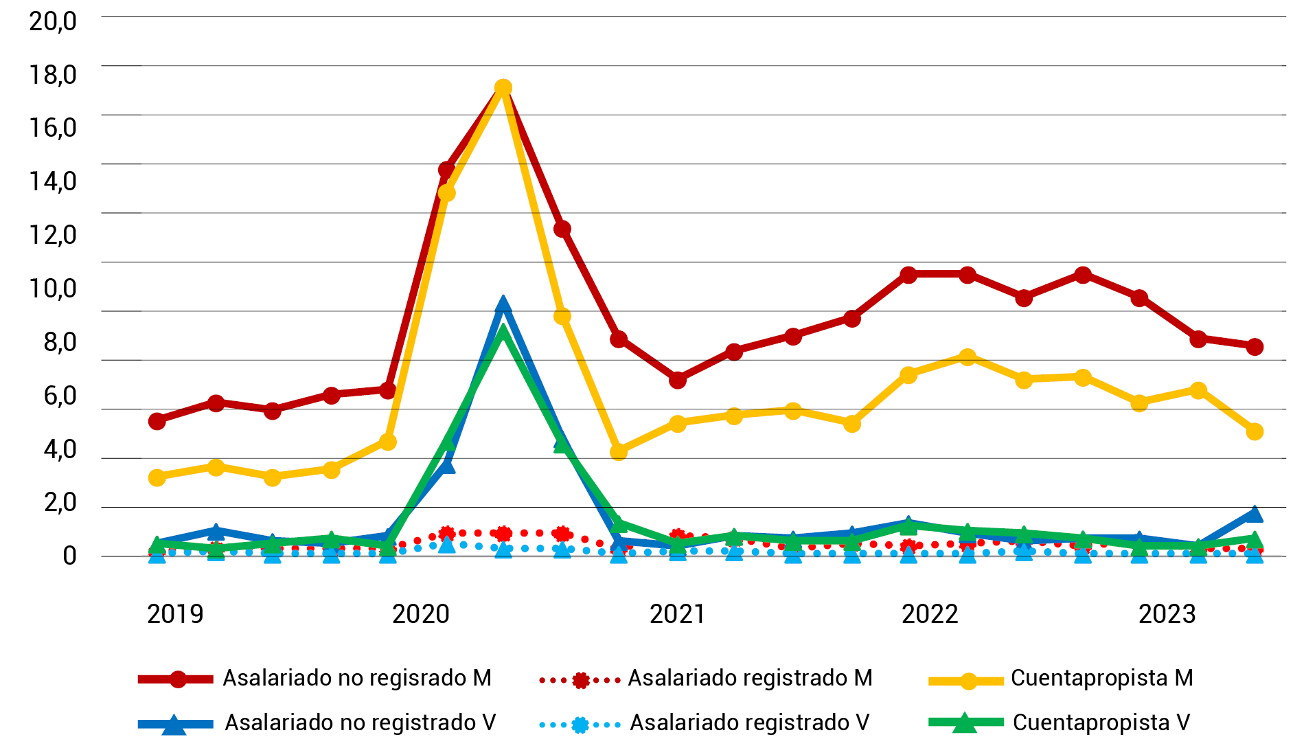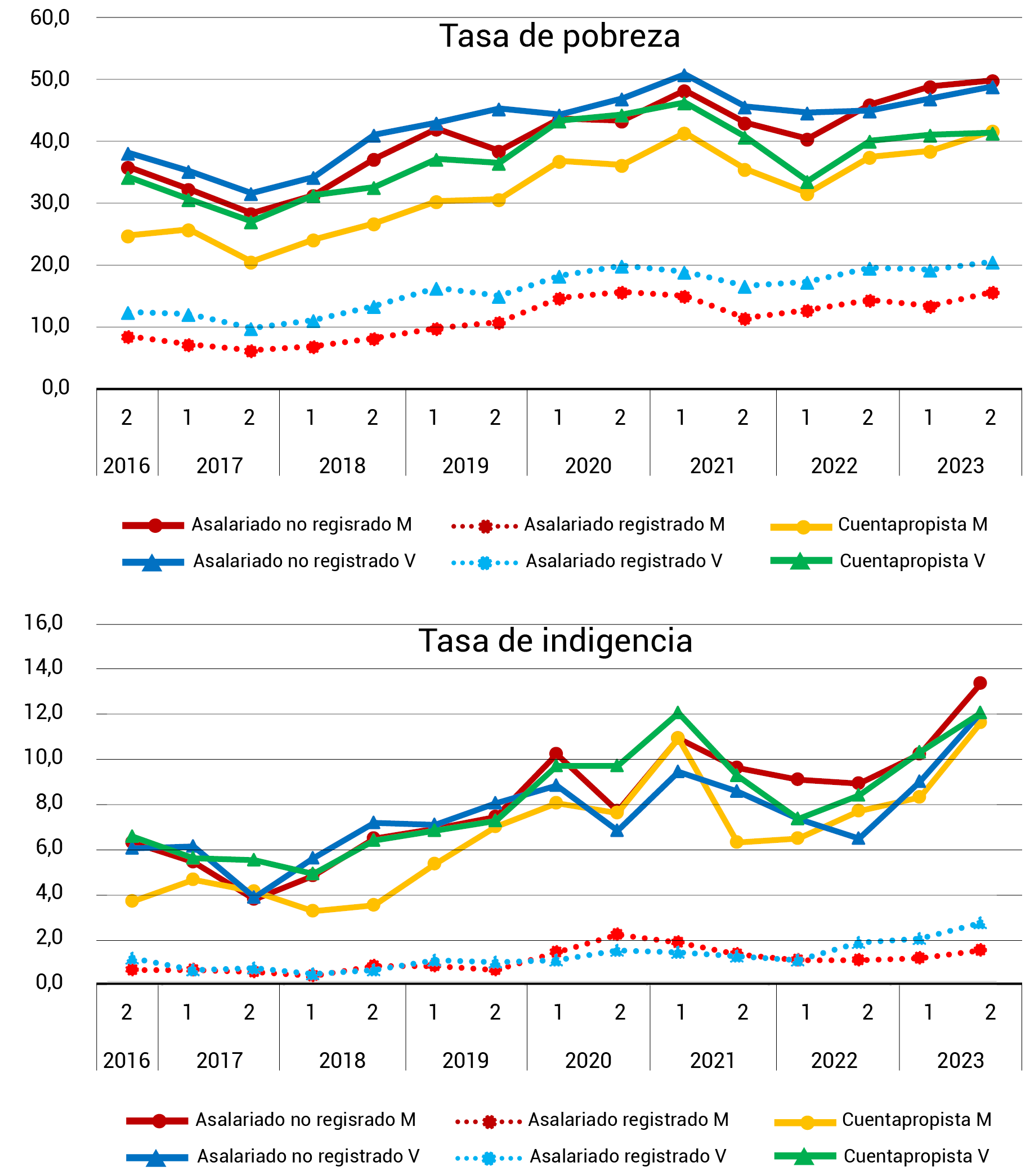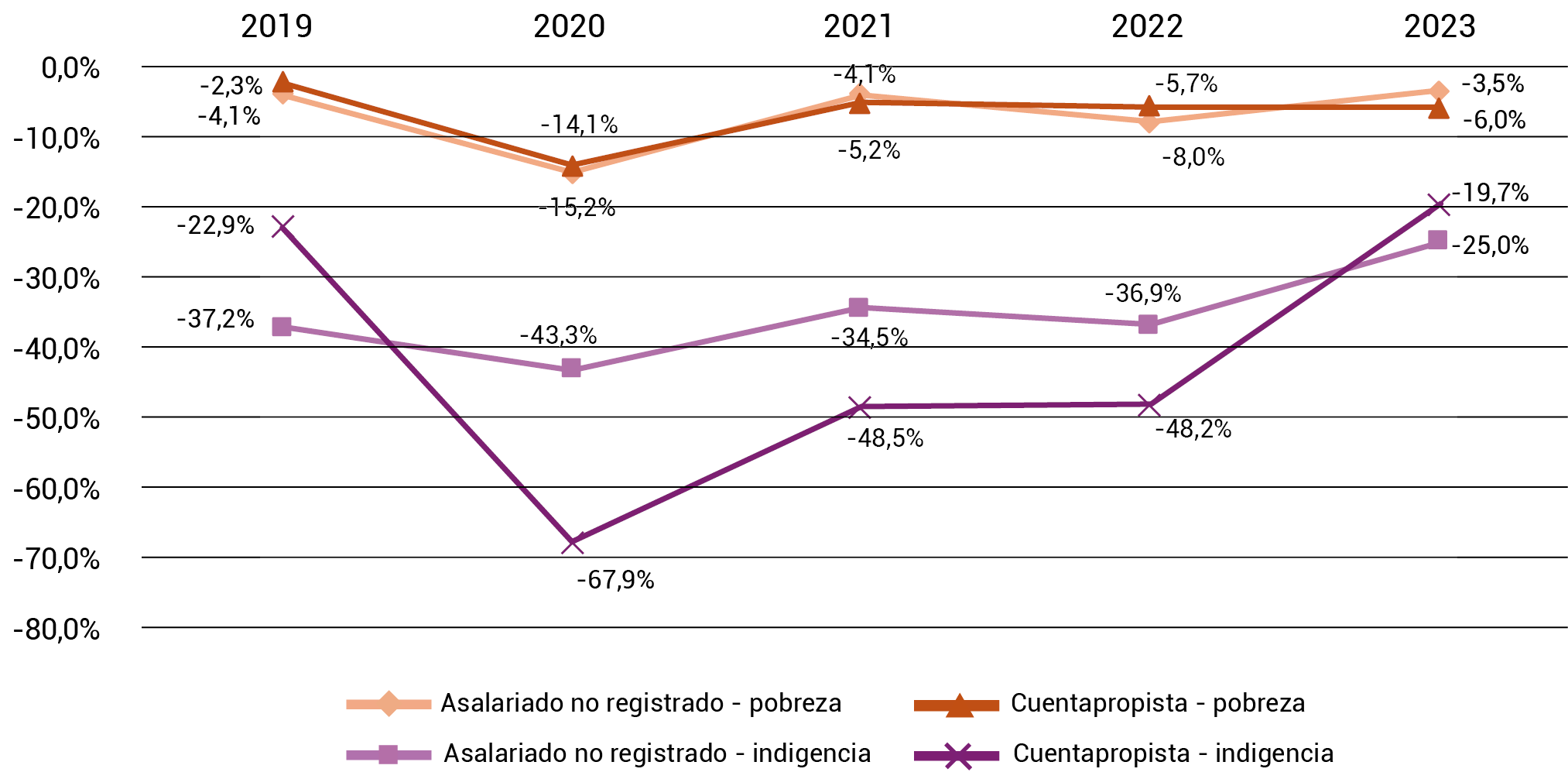 | cuenta propia | Tasa de pobreza | -4,30% | -5,20% | -12,70% | -16,00% | -3,60% | -6,80% | -11,10% | -6,10% | -4,70% | -3,20% |